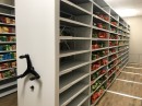 Передвижные стеллажи позволили задействовать весь доступный объём помещения, а индивидуальный стационарный стеллаж использовал ранее пустующую нишу.