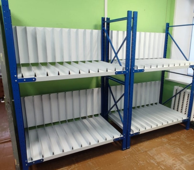 Стеллаж металлический стационарный с индивидуальными ячейками-гребенками для торцевого хранения предметов живописи.